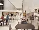 Kaffeebereich mit Tischen und Stühlen.