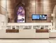 Teilweise unterfahrbarer Kassentresen mit Monitoren darüber und buntem Fenster im Hintergrund.