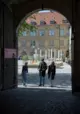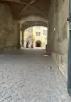 Blick vom Innenhof auf den Schillerplatz. Leicht absteigender Weg mit Kopfsteinpflaster.