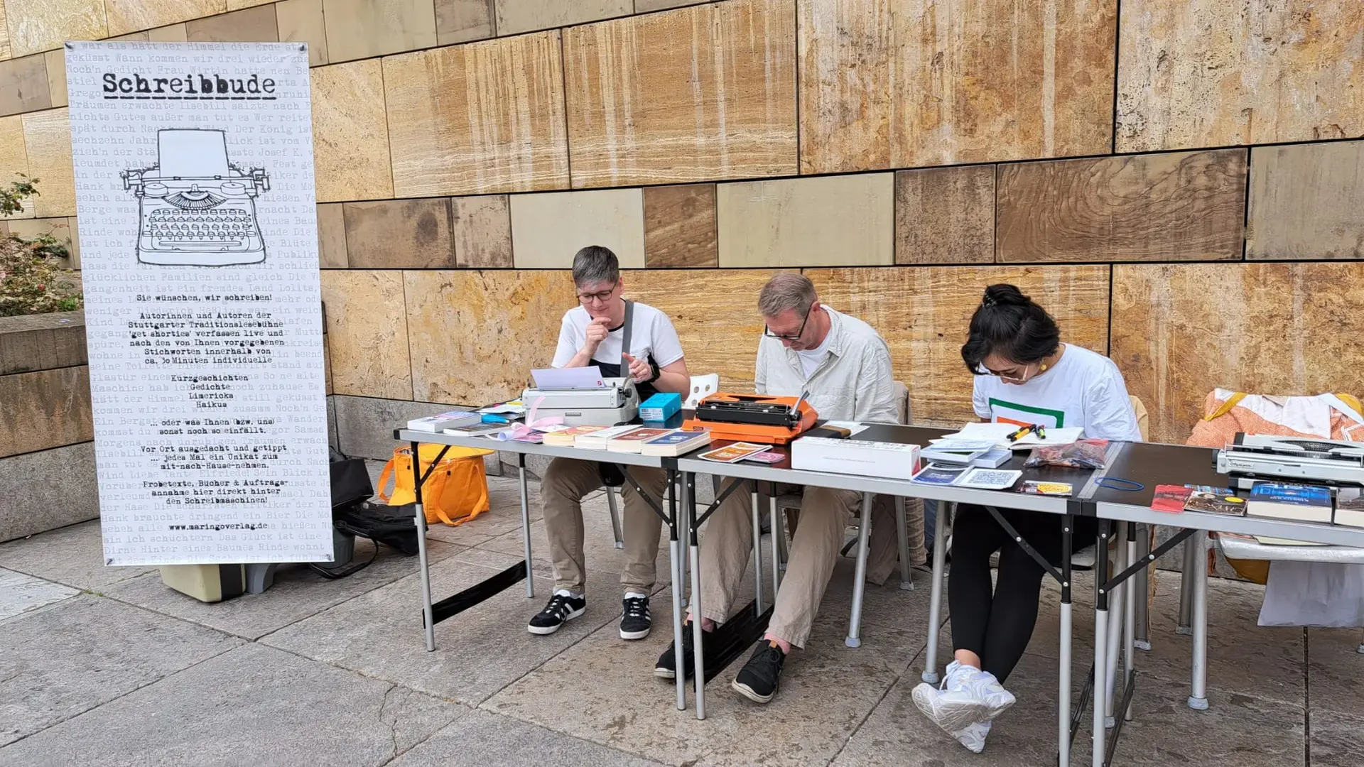 Mehrere Autor*innen und eine Zeichnerin nehmen im Foyer des Landesmuseums Platz – ausgestattet mit mechanischen Schreibmaschinen und viel Fantasie. Besucherinnen jeden Alters können ihnen drei oder mehr Stichworte geben. Daraus entstehen innerhalb kurzer Zeit individuelle Kurztexte: mal poetisch, mal humorvoll, mal überraschend – immer einzigartig.