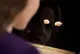 Aus Mammutelfenbein geschnitztes kleines Löwenköpfchen in einer Vitrine, davor eine Betrachterin.
