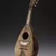 Diese zierliche Mandoline aus der Barockzeit in lautenartiger Form hat sechs Einzelsaiten – eine von vielen verschiedenen Ausführungen. Der Hals und der schalenförmige Korpus sind mit Dreiecksmuster bzw. Spänen aus Elfenbein und Palisander verziert. Auf dem Griffbrett sind eine Stadtansicht und ein Häuserensemble in Elfenbein eingraviert. Um den Hals sind noch Bünde aus Darm erhalten. Ihr raffiniertes Aussehen verweist auf den noblen Charakter der damals beliebten Lauteninstrumente.